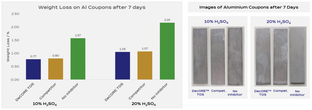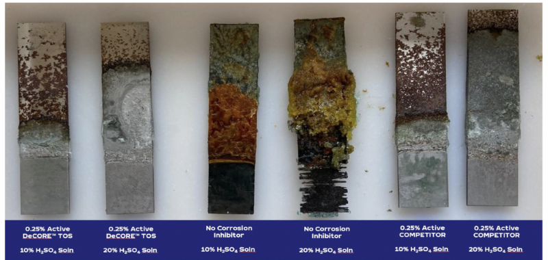 Short-term weight loss studies further confirmed effective protection of mild steel, with DeCORE™ TOS significantly reducing metal loss in both sulfuric acid concentrations.