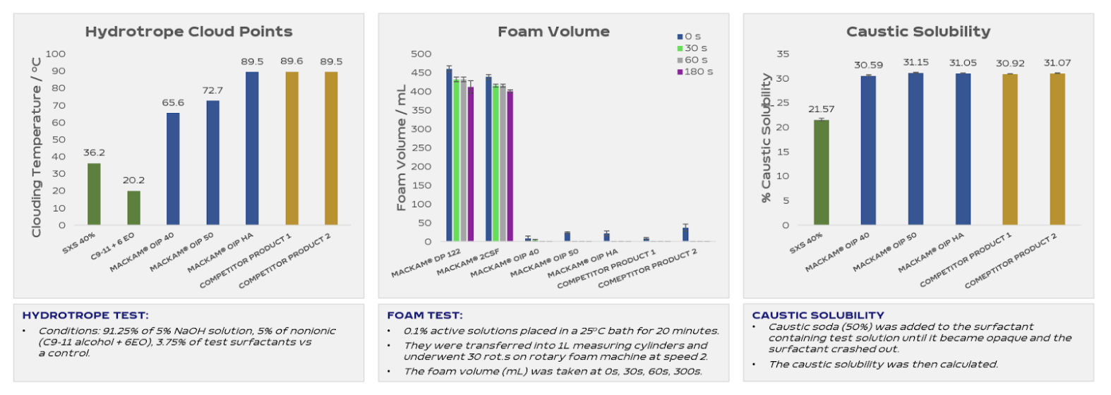Here’s a useful overview of the full range, including an introduction to the new MACKAM® OIP HA grade that offers even better hydrotropic performance while maintaining low-foaming properties and a high degree of caustic solubility.